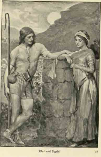 The men of Icefirth were wont to drive their sheep into the mountains during the summer, leave them there till autumn, and then, collecting the scattered flocks, tom restore to each man his own branded sheep. One autumn the flocks were wild and shy, and it was found that many sheep had stayed in the hills. When those that had been fathered were divided Thorbiorn had lost at least sixth wethers, and was greatly vexed. Some weeks later Olay Howardson went alone into the hills, and returned with all the lost sheep, having sought them with great toil and danger. Olaf drove the rest of the sheep home to their grateful owners, and then took Thorbiorn’s to Bathstead. Teaching the house at noonday, he knocked on the door, and as all men sat at their noontide meal, the housekeeper, the fair Sigrid, went forth herself and saw Olaf.